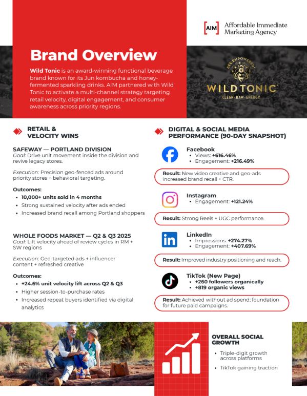 Wild Tonic partnered with AIM to increase retail velocity at Safeway and Whole Foods while improving digital presence.